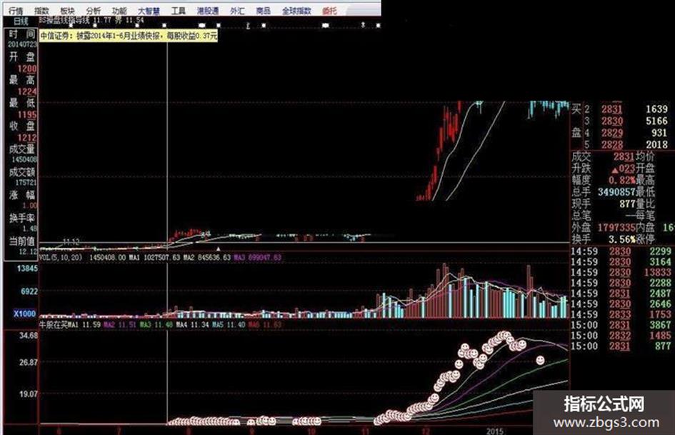 低位笑脸表明开始走牛。高位笑脸消失表明开始走弱。2014年7月23日大盘开始第一个笑脸,这一轮牛市从此确立,中信证券同一天出现第一个笑脸,是真正的牛股。还有中铁二局