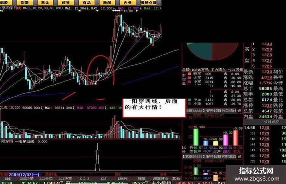 AA1:=CROSS(C,MA(C,5)) AND CROSS(C,MA(C,10)) AND CROSS(C,MA(C,20)) AND CROSS(C,MA(C,30)); AA2:=CROSS(MA(V,5),MA(V,10)); 一阳穿四线:AA1 AND AA2;
