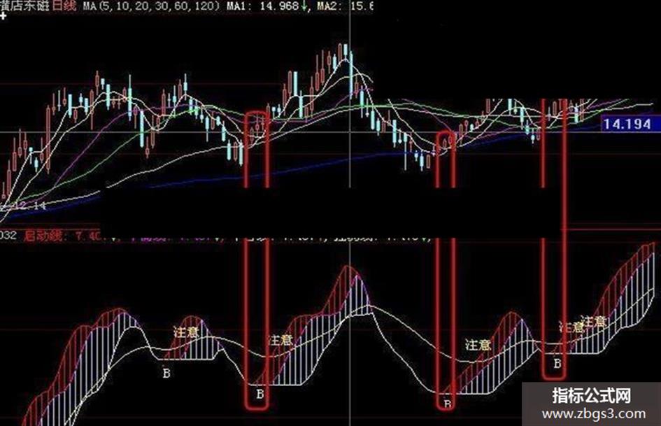 启动线:SUM(EMA((C+L)/2,2),5)/10.158,COLORRED;