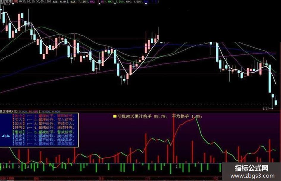 DRAWTEXTABS(0,110,' 【卖出】:-- 7.量平价跌,继续卖出。'),colorFFCC00,LINETHICK2,LAYER0;
