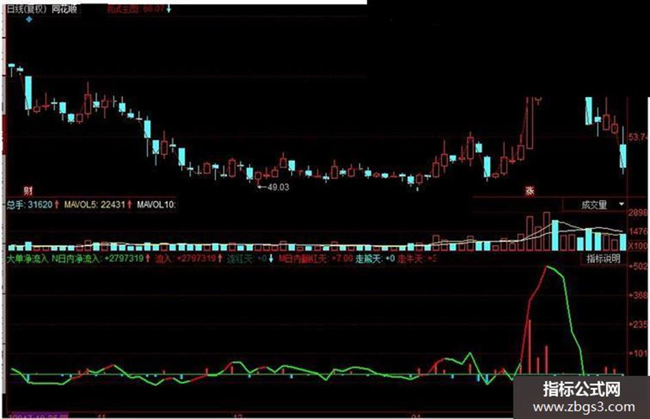 流入:IF(N日内净流入>REF(N日内净流入,1),N日内净流入,DRAWNULL),colorred,LINETHICK2;