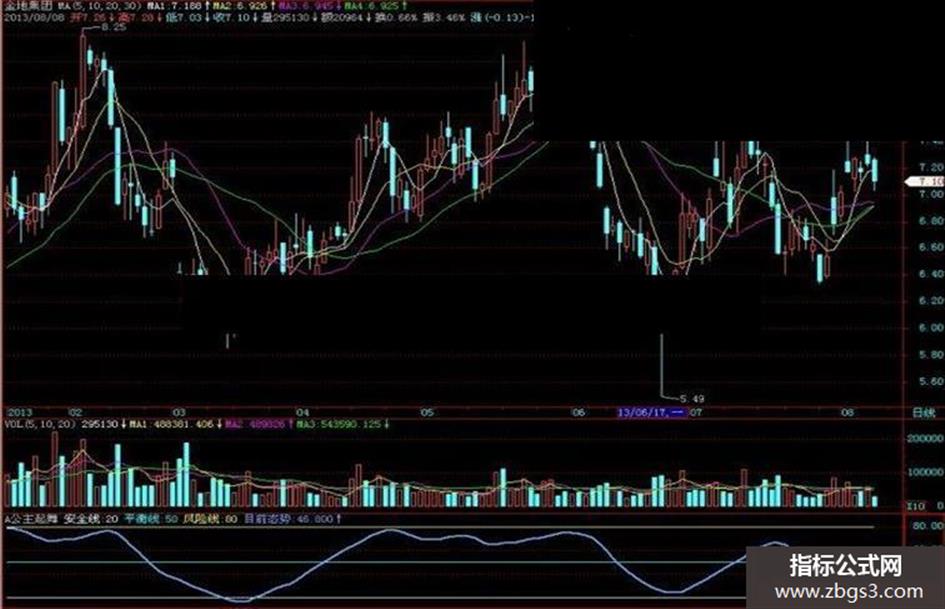 安全线: 20, ,; 平衡线: 50, ,COLORCYAN ; 风险线: 80, ,; Var3:=LLV(LOW,18); Var4:=HHV(HIGH,18); Var5:=EMA((CLOSE-Var3)/(Var4-Var3)*100,13); 目前态势: EMA(0.618*REF(Var5,1)+0.382*Var5,3),COLORFFAA66,LINETHICK2;