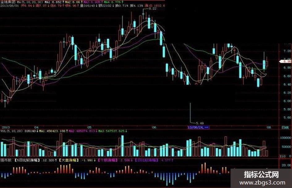 STICKLINE( 【5日比较涨幅】>=0,0 ,【5日比较涨幅】*0.2,4 ,0 )COLOR1100ff;