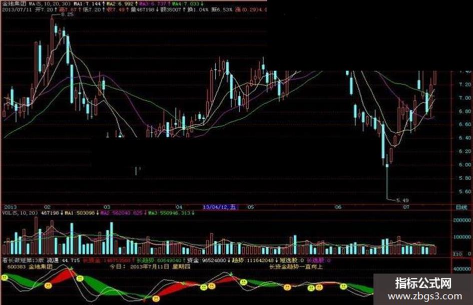 短选股:FILTER(CROSS(资金,趋势),5) and "macd.dea"<0,LINETHICK;