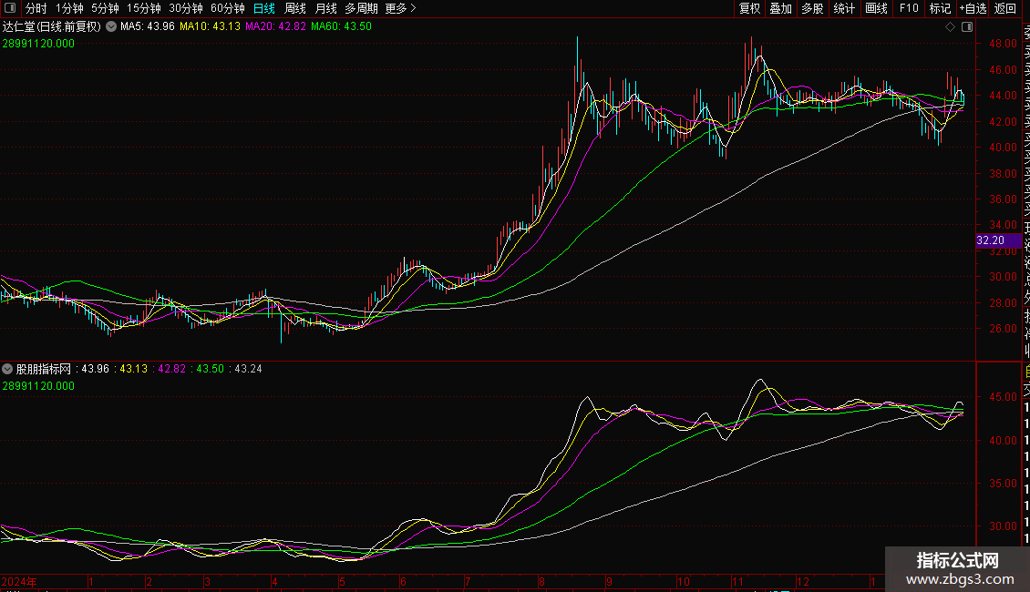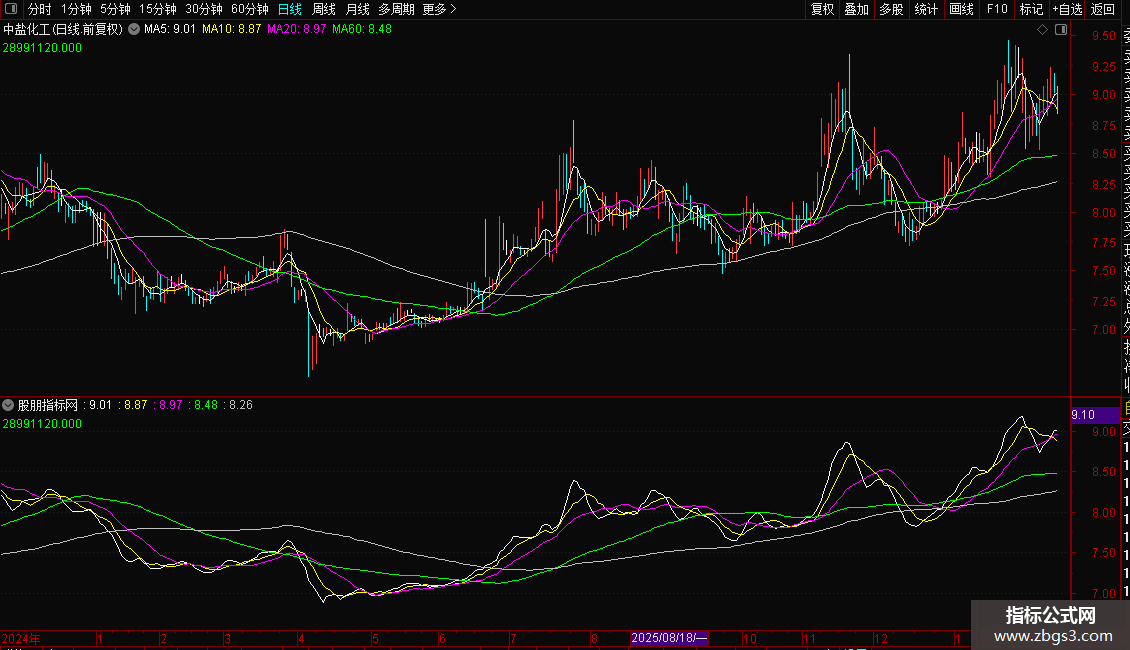 3. 均线系统:计算并显示了5、10、20、60、120日等多条移动平均线,作为趋势背景参考。