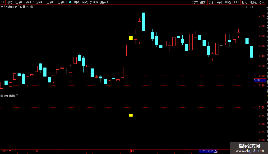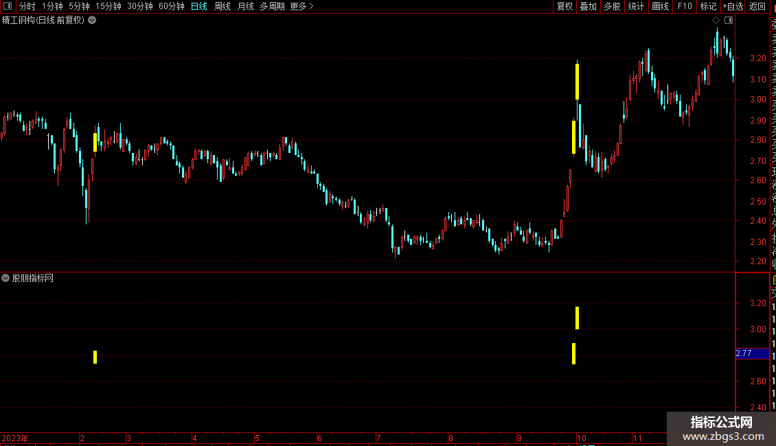 - 加载至副图后,可在符合条件的K线上看到高亮柱状标记,辅助判断短期强势走势。