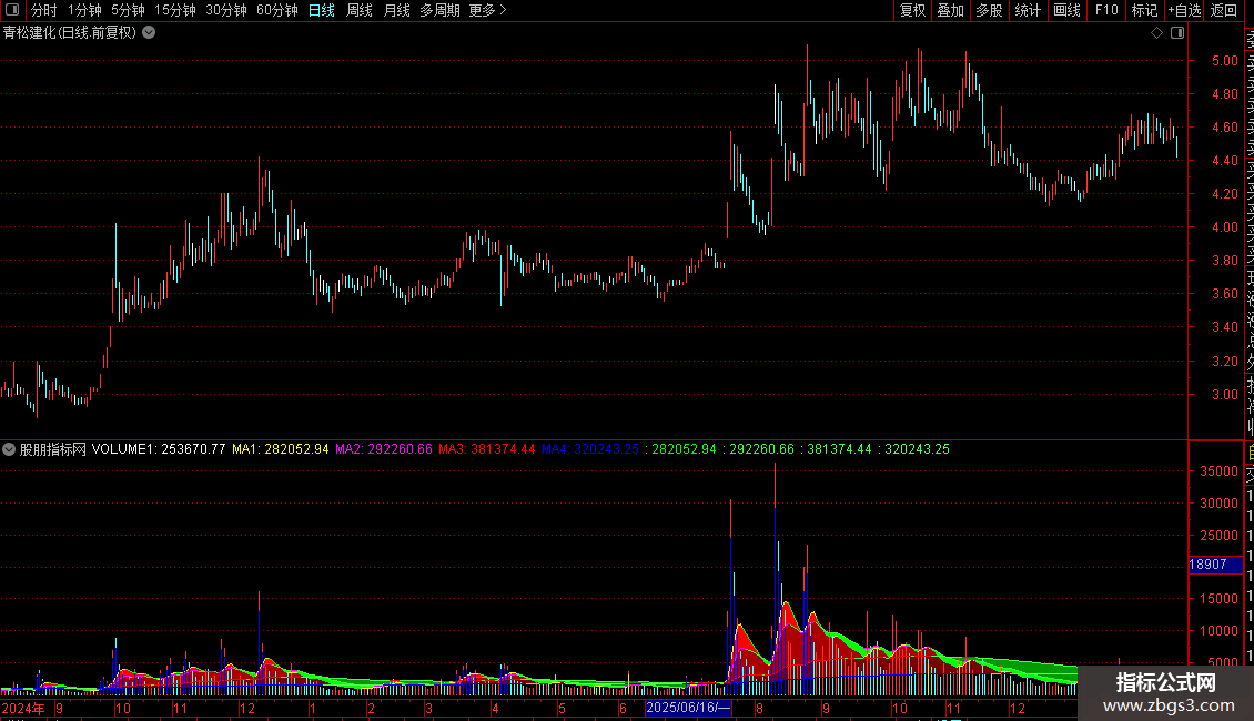 1. 绘制四条成交量均线(5、10、60、250日),并用彩色带状区域区分不同周期均线间的空间。