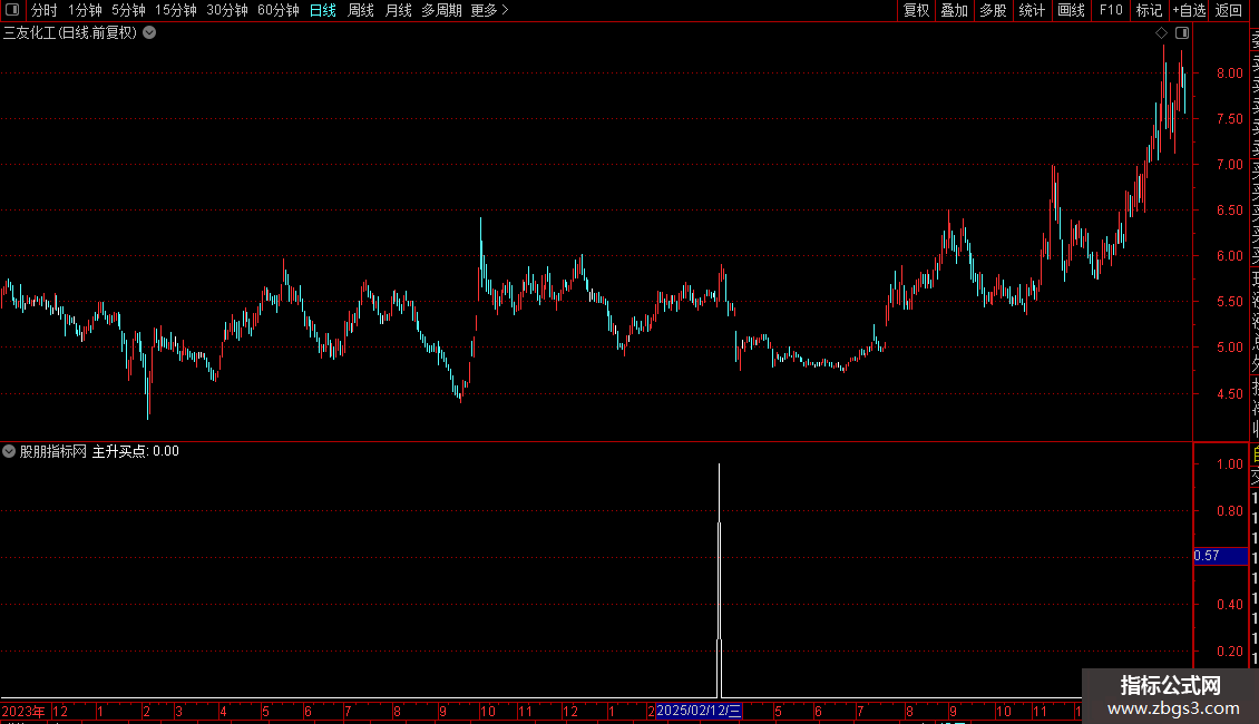 当所有条件同时满足时,指标输出信号“1”,标记为“主升买点”;否则输出“0”。