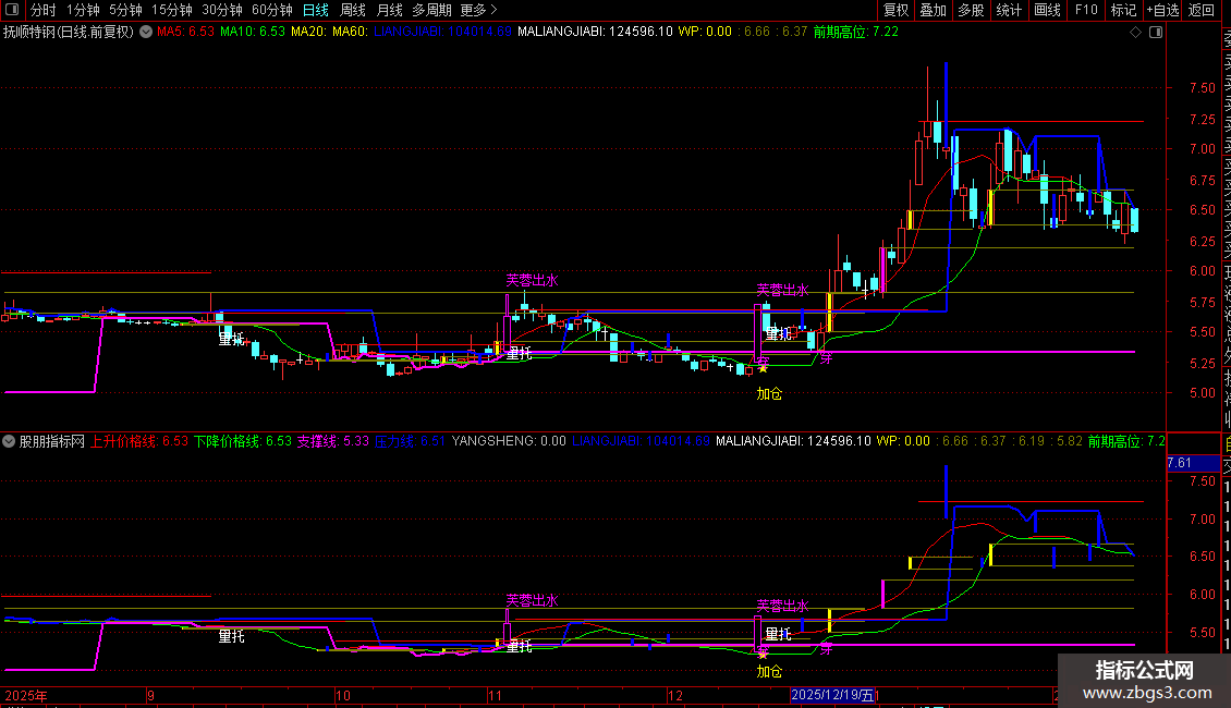 5. 形态标记:自动标记“加仓”、“芙蓉出水”、“一穿三”等特定K线形态。