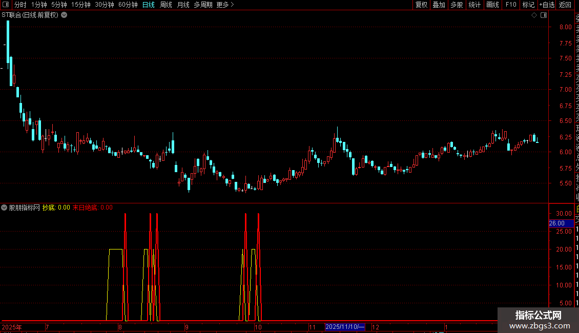 末日绝底信号: 当指标显示为30的红色粗柱状线时,表示“抄底”信号刚刚消失,可能意味着一个更强烈的底部确认点或“绝地反弹”机会。