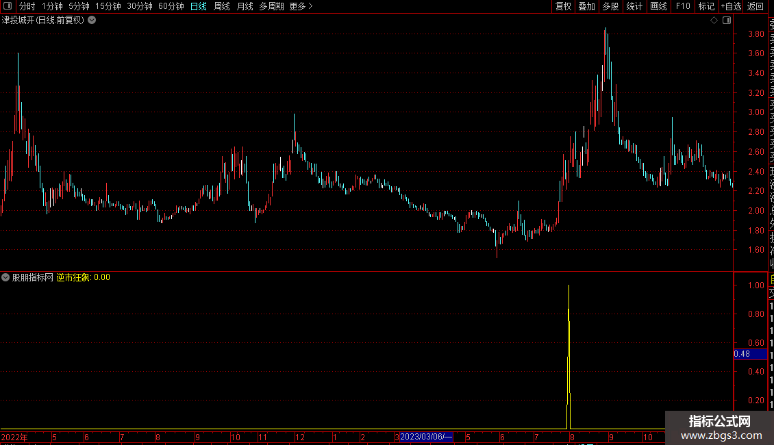 指标名为“逆市狂飙”,是一个复合型选股公式。其核心逻辑是识别在特定市场条件下,股价可能出现强势上涨的形态。