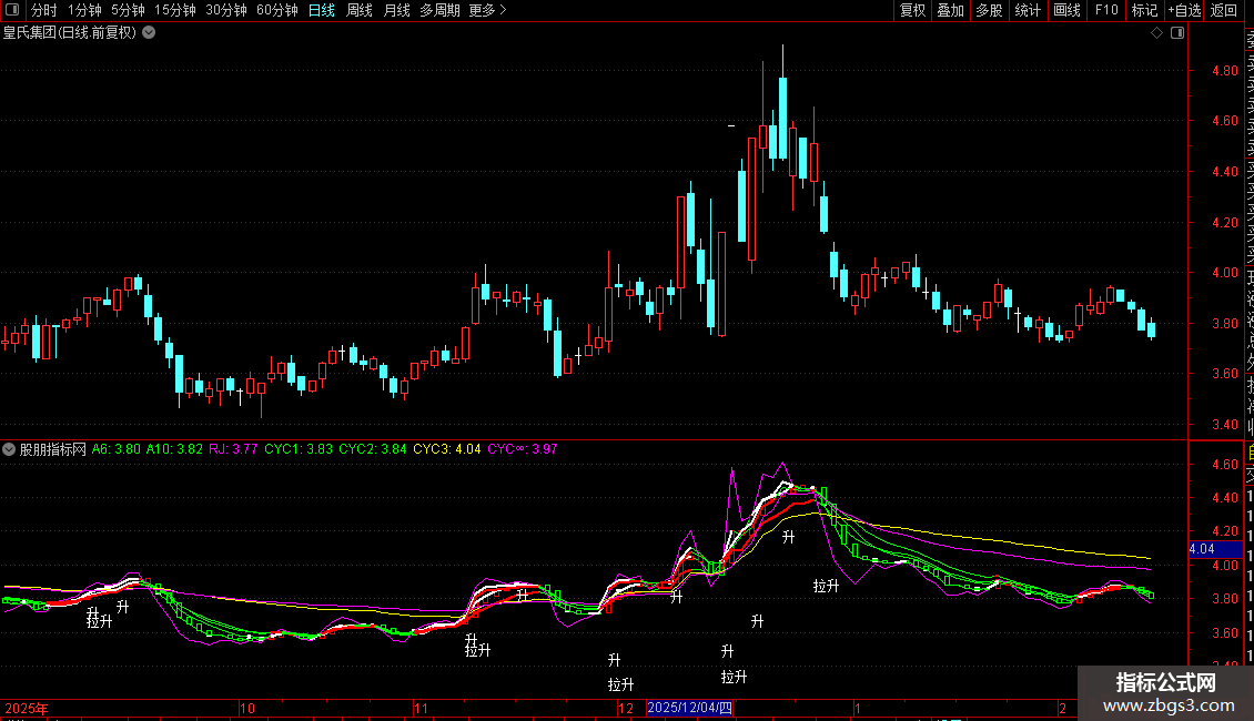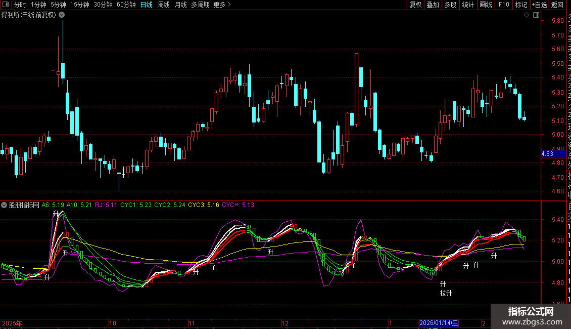 副图:用于观察股价与各条均线、成本均线的相对位置关系,以及“升”/“拉升”信号的出现,辅助判断趋势和入场时机。