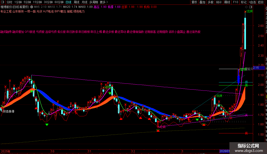 1. 自动趋势线:自动识别并绘制不同周期的支撑线(灰色、品红色)和压力线(灰色、品红色),以及短期压力(黄绿色)和支撑(黄绿色)线。