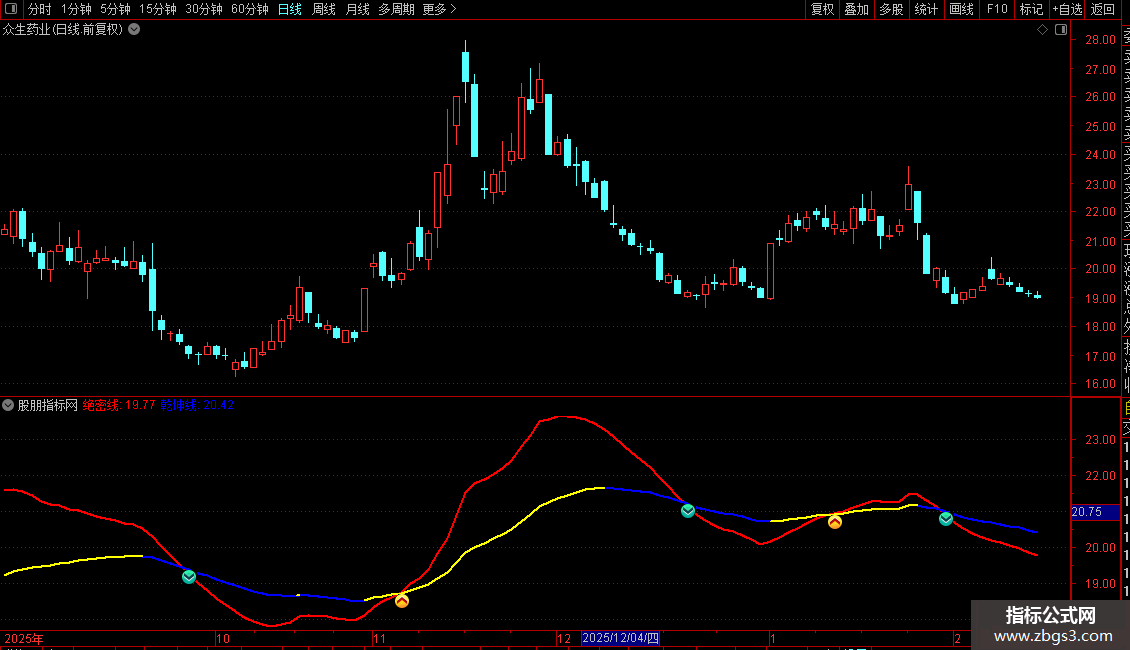卖出信号:当乾坤线向上穿过绝密线时,在乾坤线位置显示卖出图标。