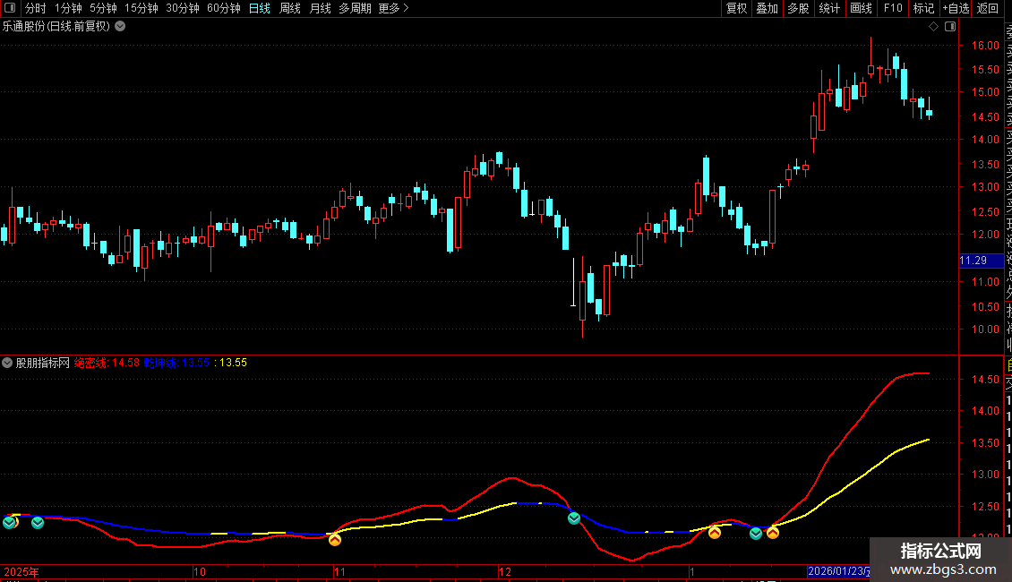 指标包含两条均线(绝密线和乾坤线)及买卖信号。