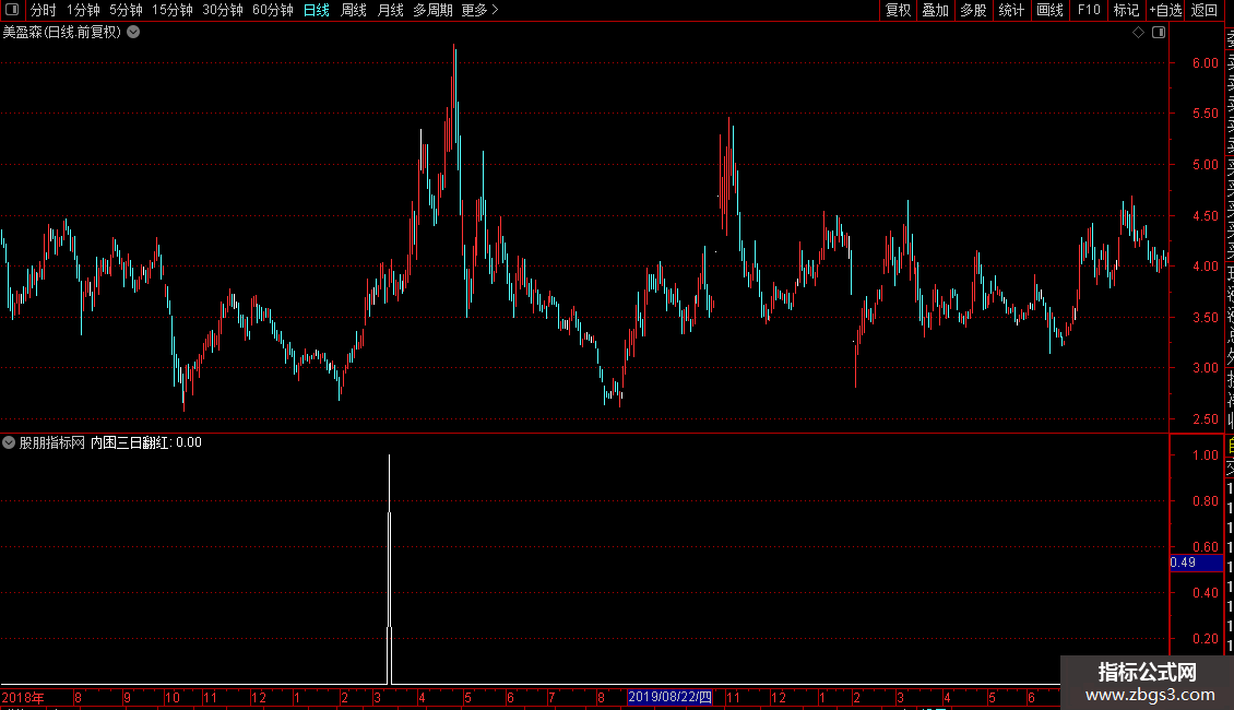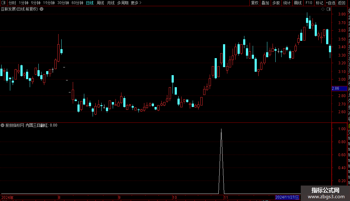 - 当“内困三日翻红”条件成立时,指标标记买进信号。