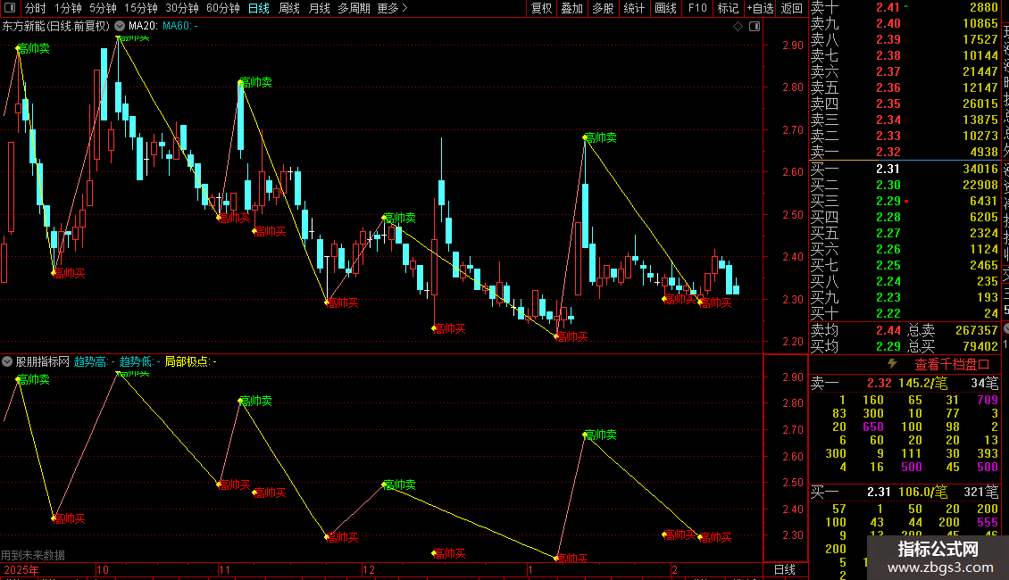 3. 买卖提示:在筛选出的“极点”位置,分别标注“高帅买”(红色,出现在局部低点)和“高帅卖”(绿色,出现在局部高点)的文字提示,为交易决策提供参考。