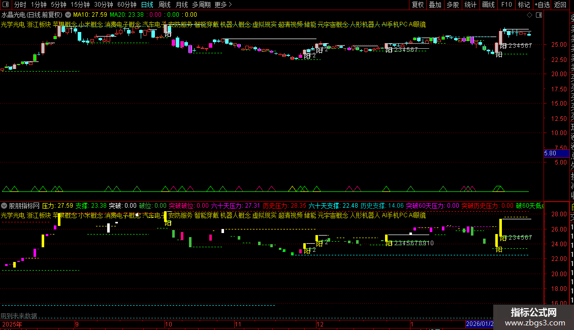 压力与支撑:自动识别并绘制基于价格和指标形态的动态压力线(黄色)和支撑线(绿色)。