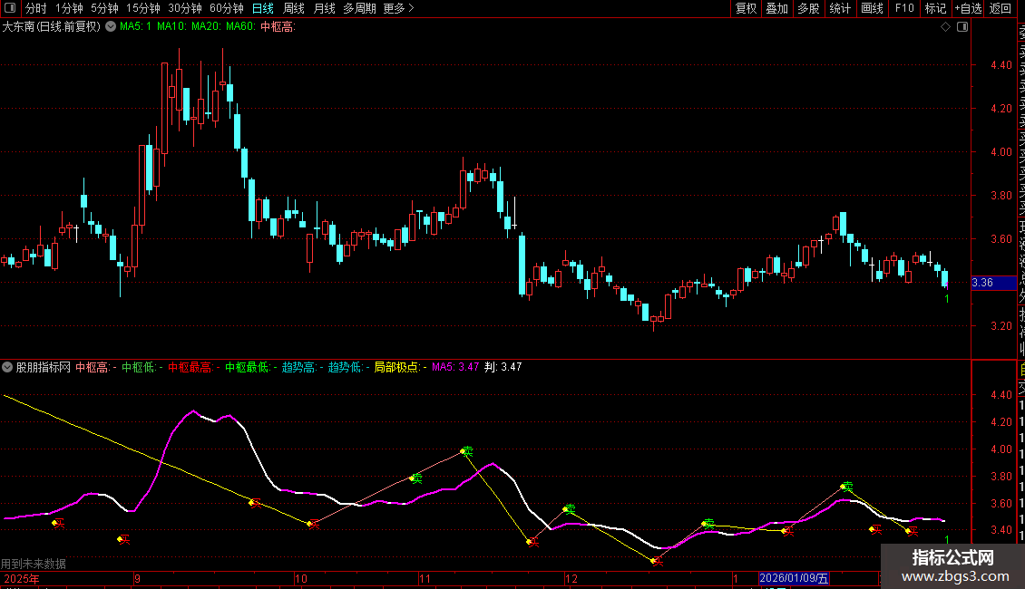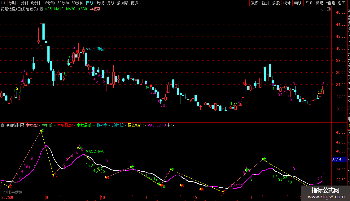 1. 趋势与中枢分析:自动识别并绘制股价运行的中枢区间(震荡区域),并标注其高、低、上、下沿。同时,可显示基于ZIG函数的趋势高、低线。