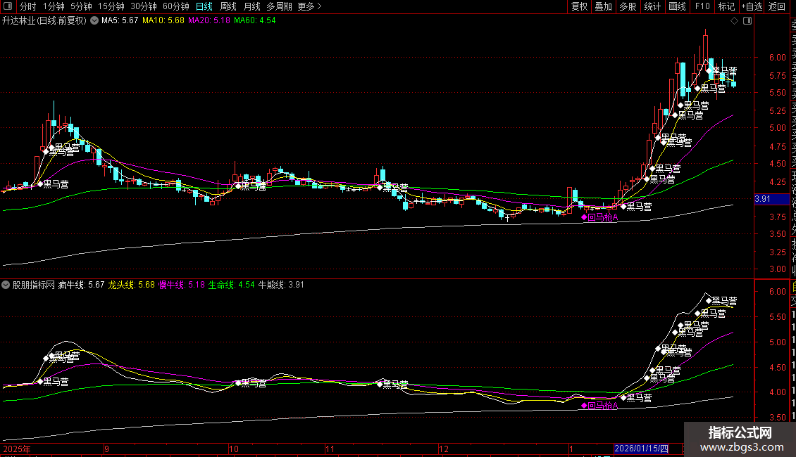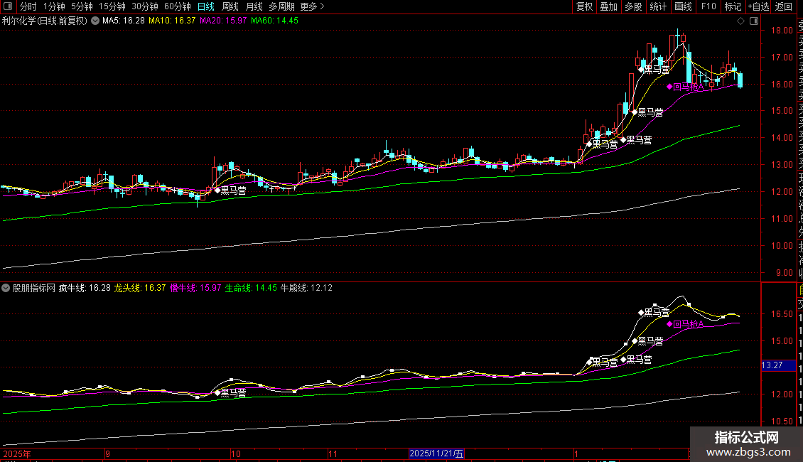 1. 多周期成本均线系统:包含疯牛线(3日)、龙头线(8日)、慢牛线(25日)、生命线(79日)和牛熊线(248日),用于判断不同时间维度的趋势和支撑压力。