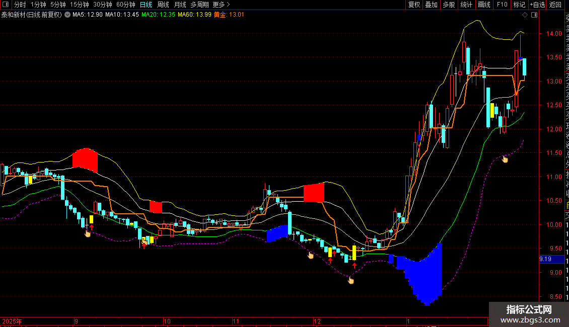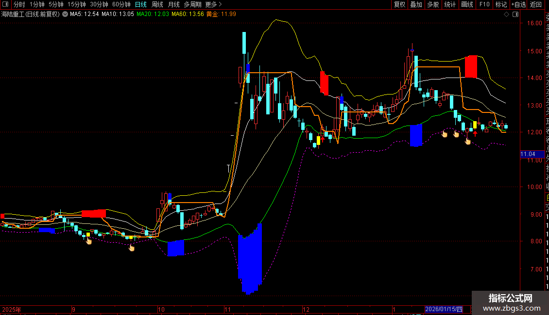 1. 布林通道系统:包含中轨(20日均线)、&177;1倍标准差的上/下轨(常规通道)以及&177;2倍标准差的上上/下下轨(极端通道),用于识别价格波动区间和超买超卖。