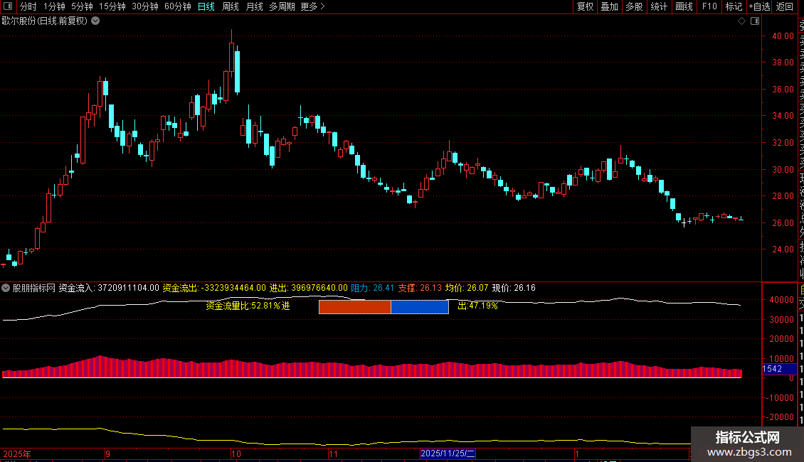 4. 柱状图:根据“进出”值的正负,在副图上绘制红柱(净流入)或青柱(净流出)。