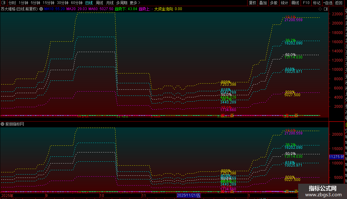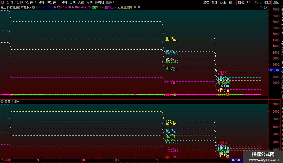 3. 黄金分割线:基于动态高低点,绘制一组黄金分割位(如0.191, 0.382, 0.5, 0.618, 0.809),作为潜在的支撑阻力区。