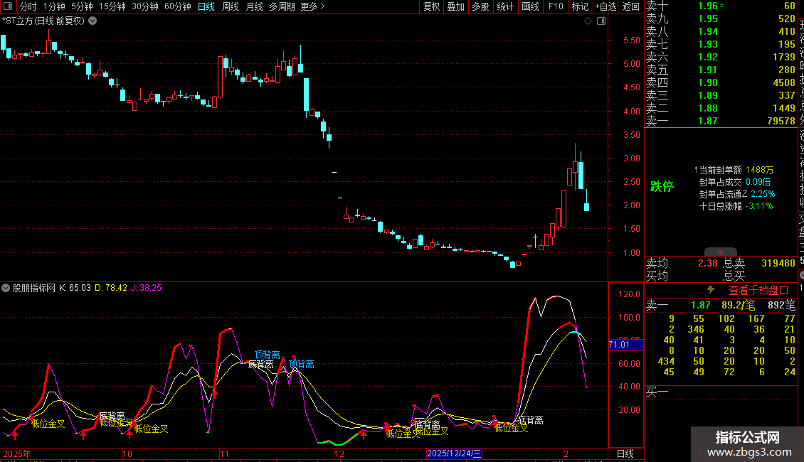 4. 超买超卖警示:对J值、K值、D值进入极端区域(如J<0, J>90, K>90, D>85)进行高亮显示,警示风险或机会。