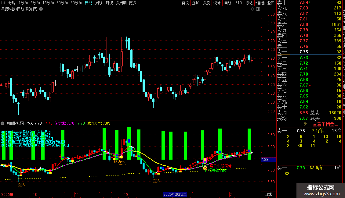 均线(PMA与多空线)的金叉死叉、颜色变化用于判断短期与中期趋势方向。