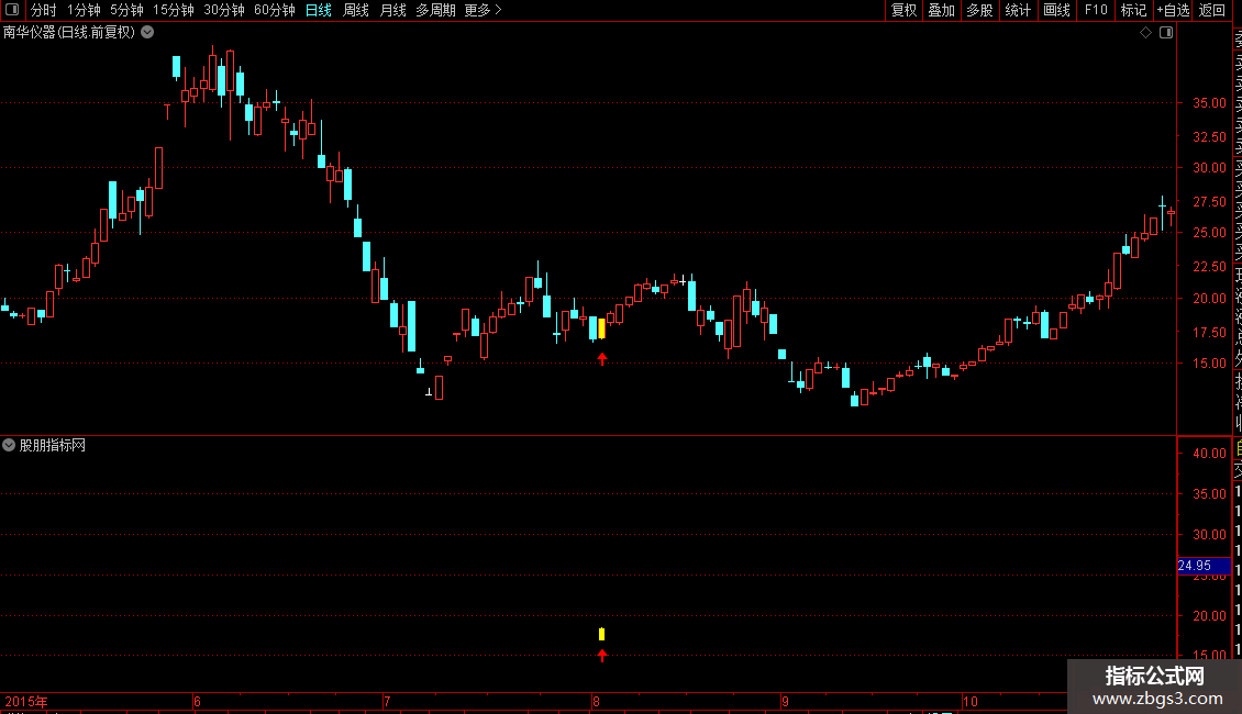 副图指标:加载后,当出现黄色高亮K线及底部图标时,提示关注。