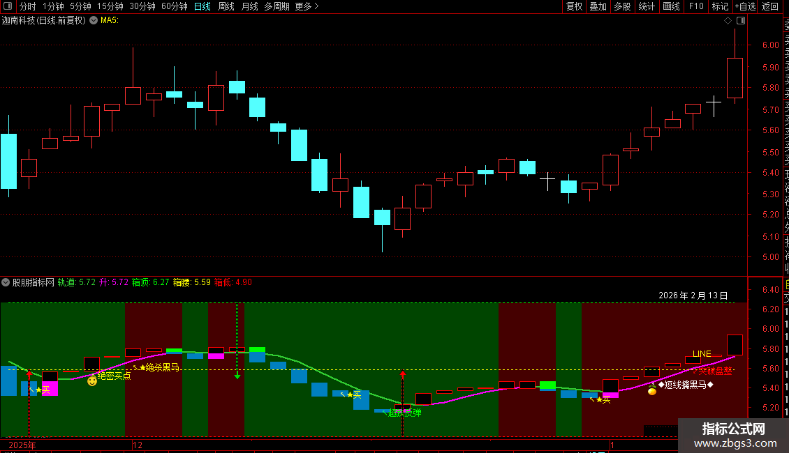 3. 轨道线:绘制基于3日收盘价均线的轨道,并用紫色线标识上升段。
