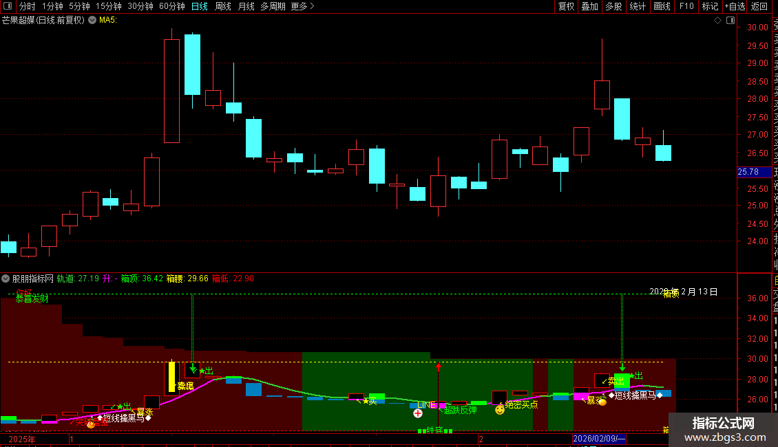 6. 箱体系统:基于近期高点和ZIG转向函数,动态绘制箱体的顶、腰、底,并标记箱体突破信号。