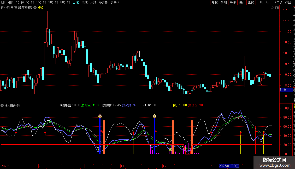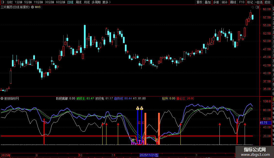 2. 波段趋势分析:通过“波段王”、“波段鬼”和“趋势线”等曲线,描绘股价的短期波动与中期趋势。当“趋势线”上穿数值10时,发出底部信号。