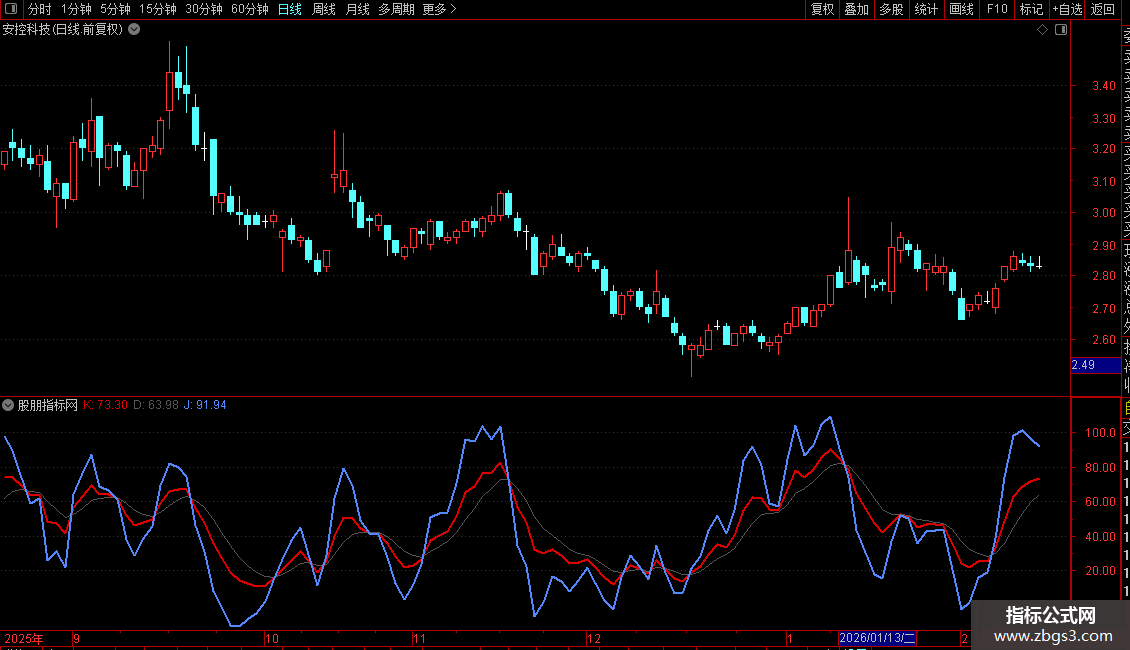 指标为KDJ随机指标,用于判断价格超买超卖状态。