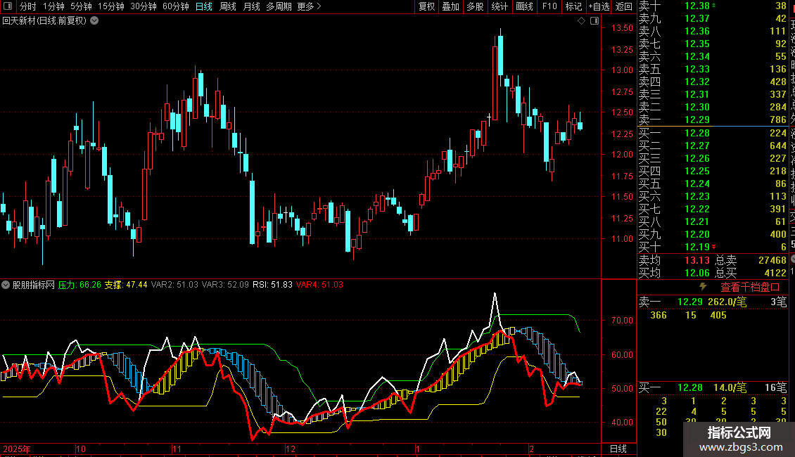2. 压力与支撑:通过计算RSI的3日均线在13日内的最高值和最低值,形成动态的压力带(绿色)和支撑带(黄色)。