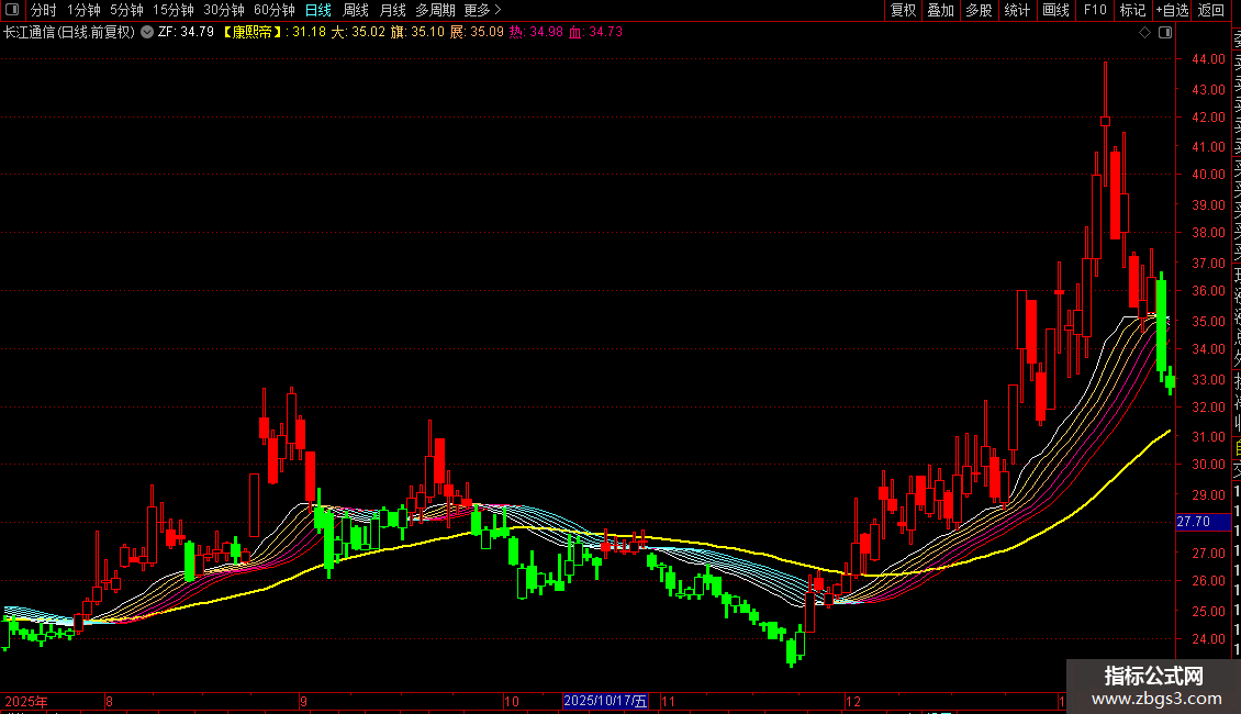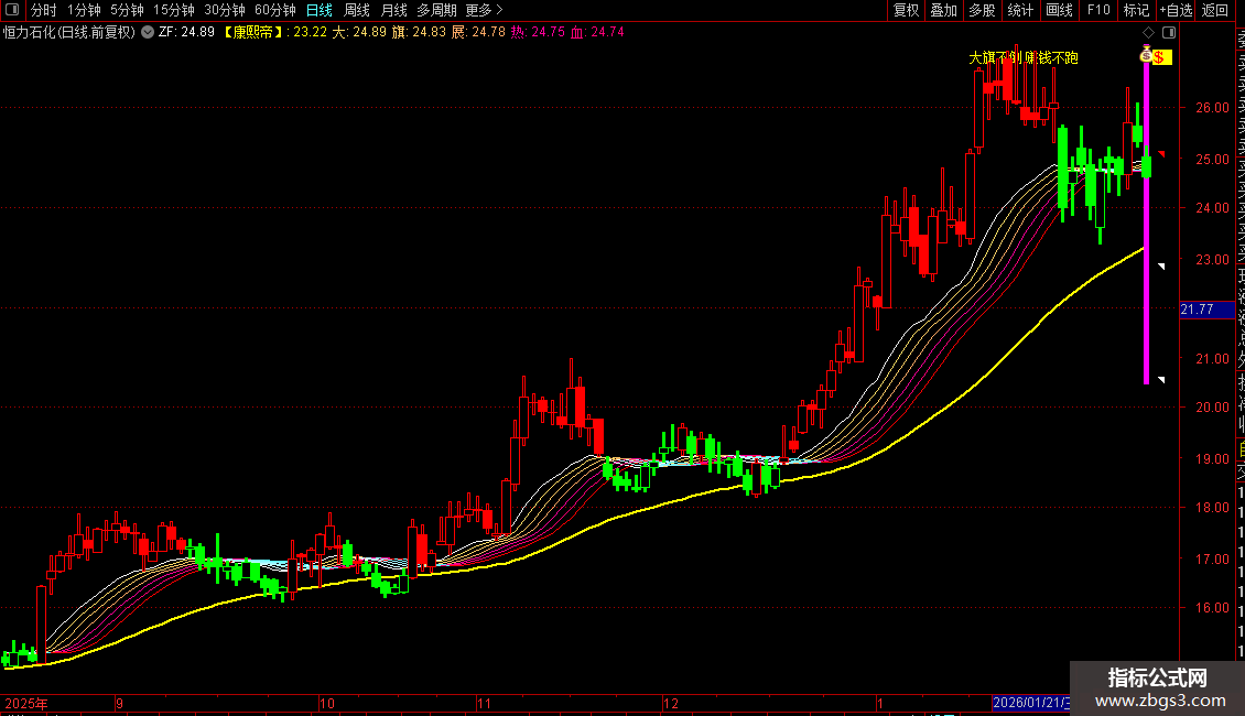 3. 八旗兵趋势系统:通过一组经过多重平滑处理的均线(大、旗、展、热、血、染),形成类似瀑布线的趋势指标,用于判断趋势的强弱和方向。其中“康熙帝”线为核心趋势线。