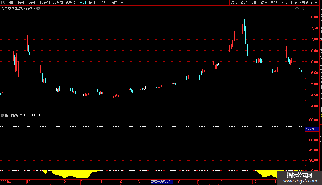它在主图或副图显示三条核心线:绿色短线、红色中线、黄色长线,分别对应21、37、55周期。指标在数值15和80处绘制水平参考线。