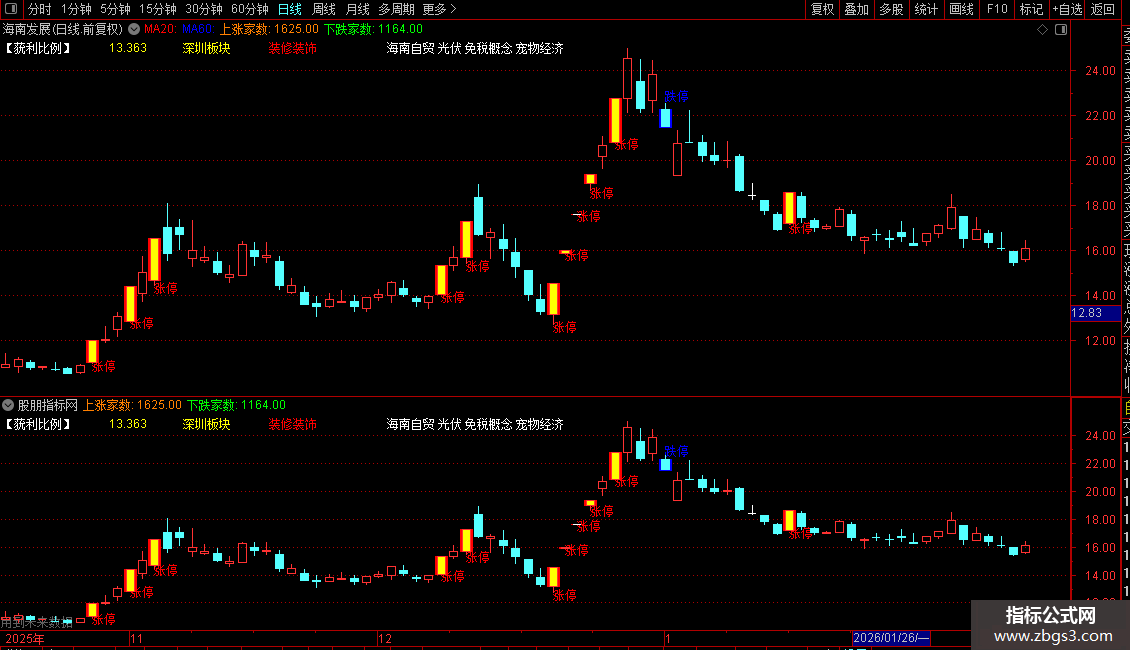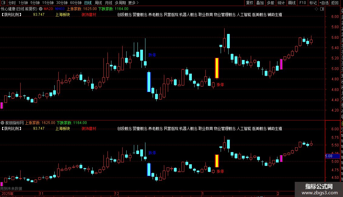 1. 特殊K线标识:用不同颜色高亮显示涨停、跌停及涨幅超过9.5%的K线。