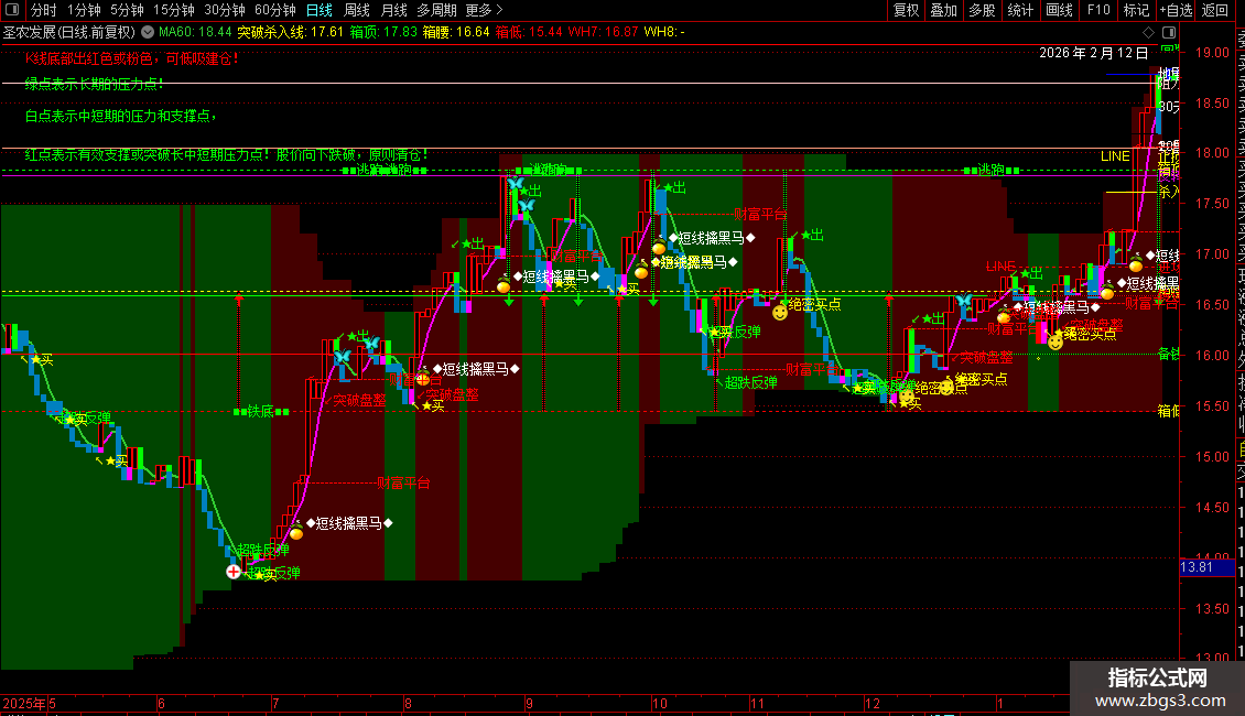 箱体系统:根据算法绘制“箱顶”、“箱腰”、“箱低”三条水平线,构成一个价格箱体,并标记箱体内的转折信号。