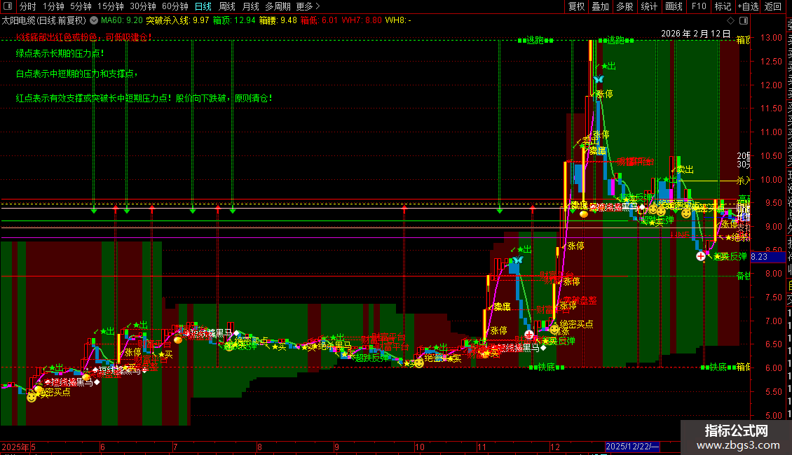 指标信息量极大,覆盖趋势、位置、形态、买卖点。使用者应重点关注: