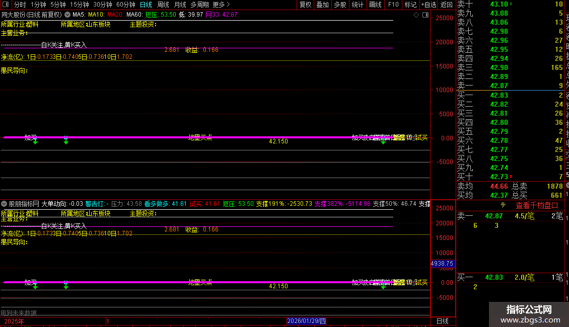 4. 资金流向可视化:通过计算“大单动向”,在K线实体内部用红绿渐变色柱状图直观显示大单资金净流入/流出强度。