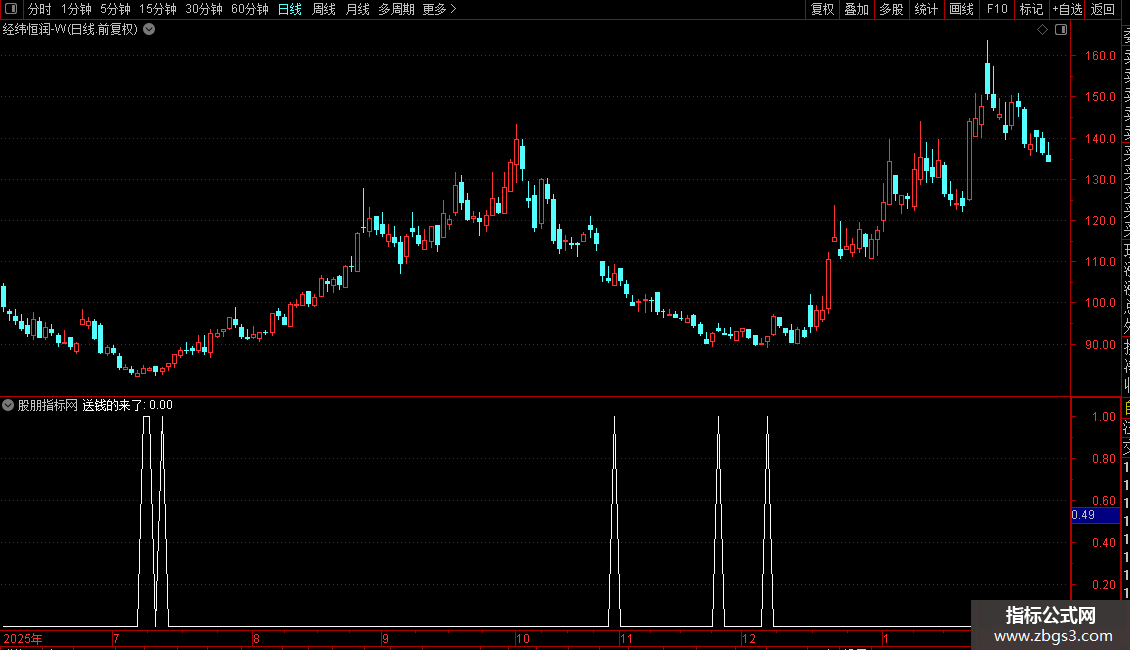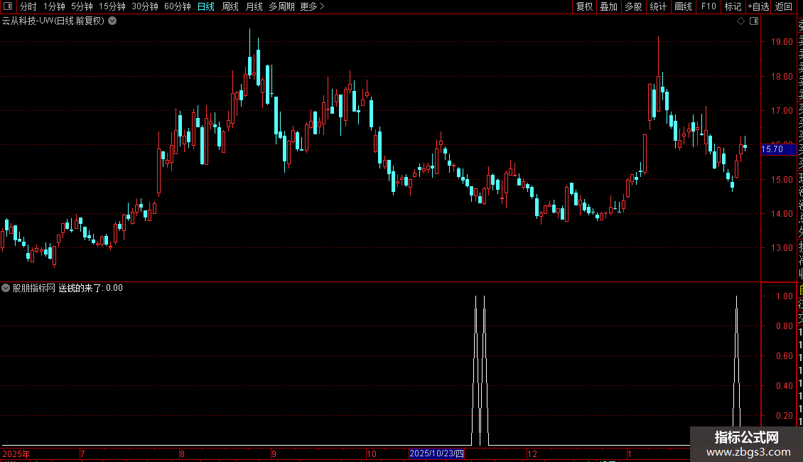 指标用于识别潜在的买入信号,命名为“送钱的来了”。它通过两组条件组合判断: