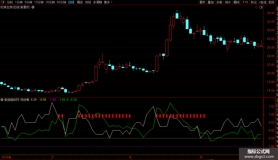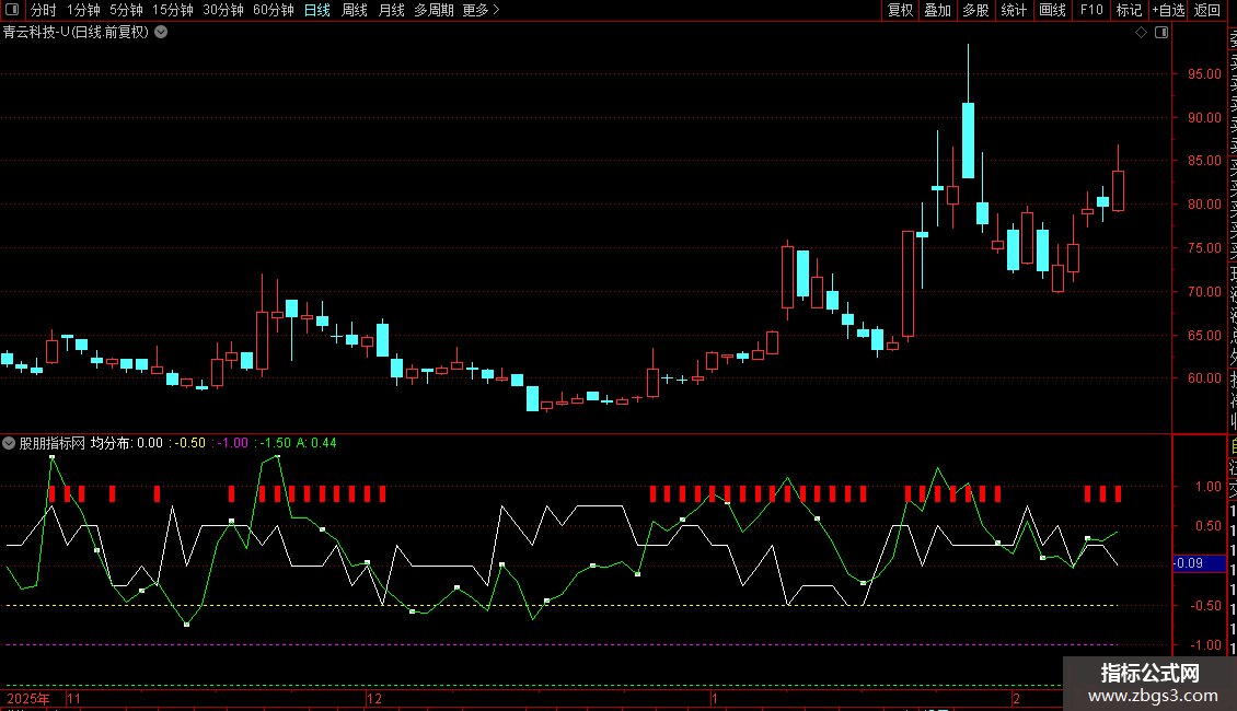 同时,指标引入CCI(商品路径指数)来度量价格偏离常态的程度。最终输出线“A”是“均分布”与CCI的均值,用于综合判断。
