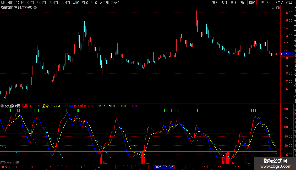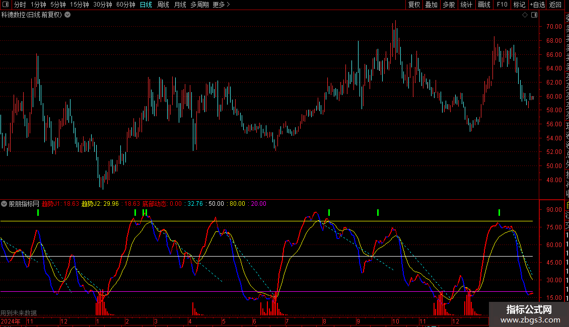 2. 反弹信号:绿色箭头标记超跌反弹买点(需满足K上穿D、乖离率<-6等条件)。