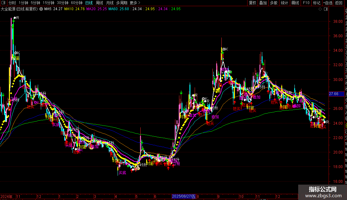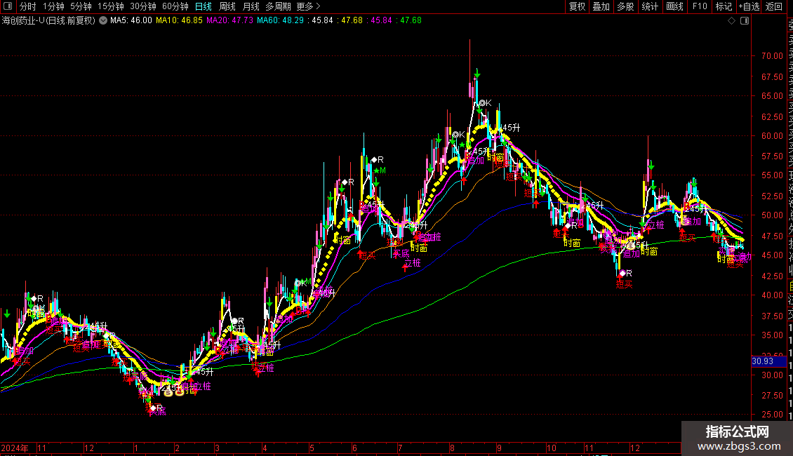 加载到主图后,图表会显示丰富的均线、彩色K线和各类信号标记。交易者可结合均线排列、信号图标和背离提示来综合判断趋势和寻找买卖点。