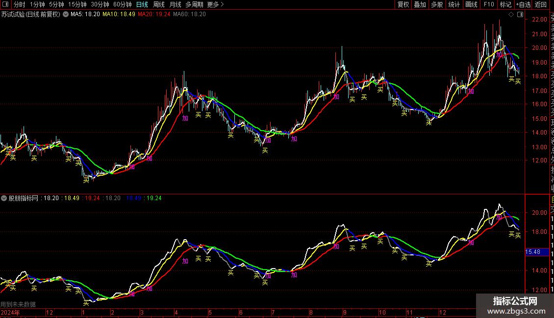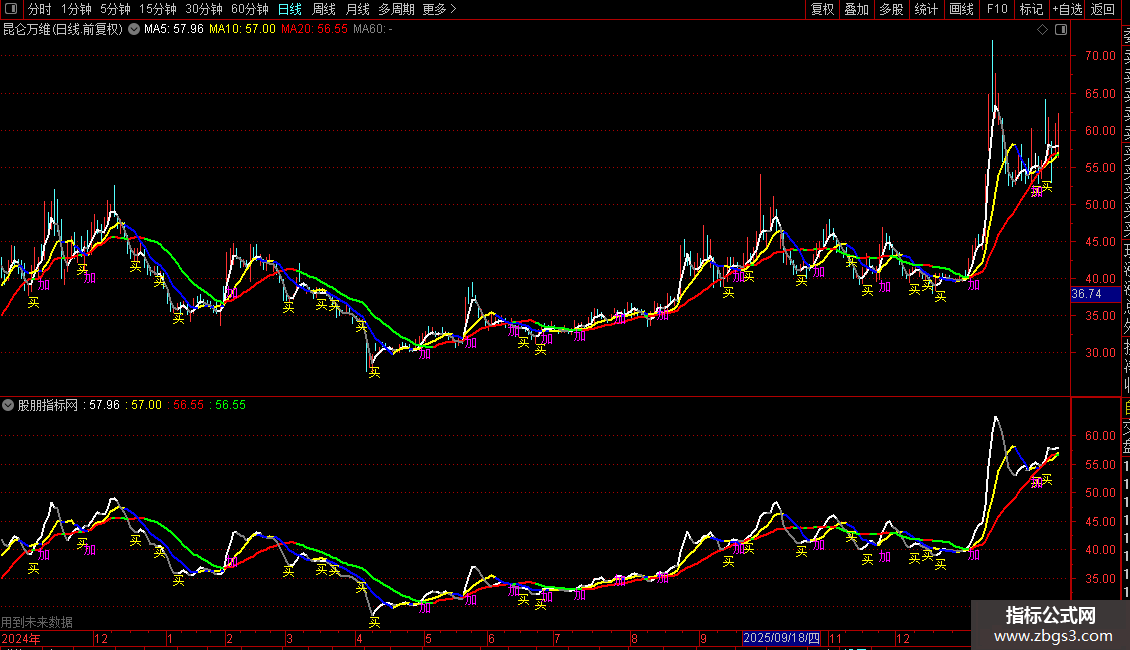 2. 当加仓信号条件成立时,在K线最低价下方2%的位置标注洋红色“加”字。