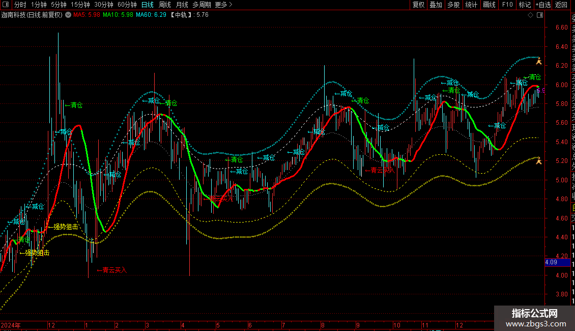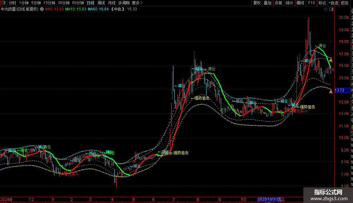 1. 趋势判断:主要观察“操盘线”的颜色(红升绿降)和“中轨线”的倾斜方向,结合价格与“高压/低撑”通道的位置关系,判断市场主要趋势。