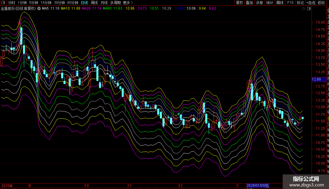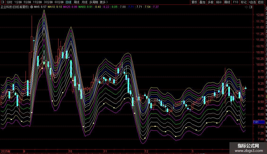 总结:指标通过一个独特的算法生成一条动态基准线,并围绕它构建了一个多层次的压力支撑网格系统,用于判断股价运行的强弱区间和潜在的转折点。