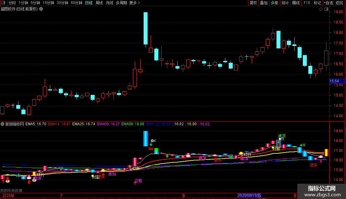 下:=EMA(中,5),COLORWHITE,LINETHICK1;