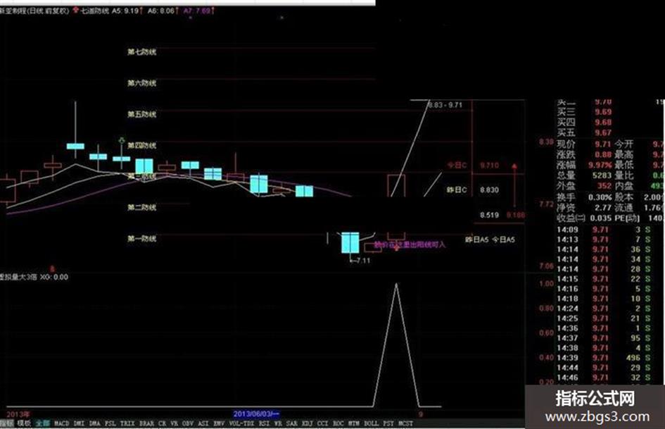 用法说明:在开盘前的9:26-9:30就可以发现,如果股价在第一防线区, 在3个点以下可以介入,会有不小的收获; 如果在高位则风险很大。